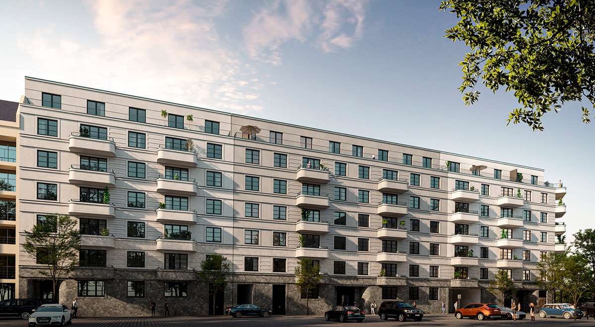 The residential complex is located in the historical part of Berlin, in the Schöneberg district. Nearby are St. Matthias Church, Heinrich von Kleist Park, Berlin Chamber Court and other historical buildings. In doing so, the new homes will be integrated with the existing buildings, creating the feeling that they have always been there.
