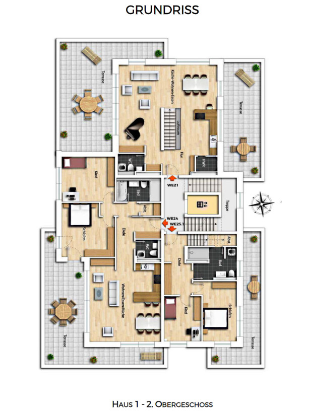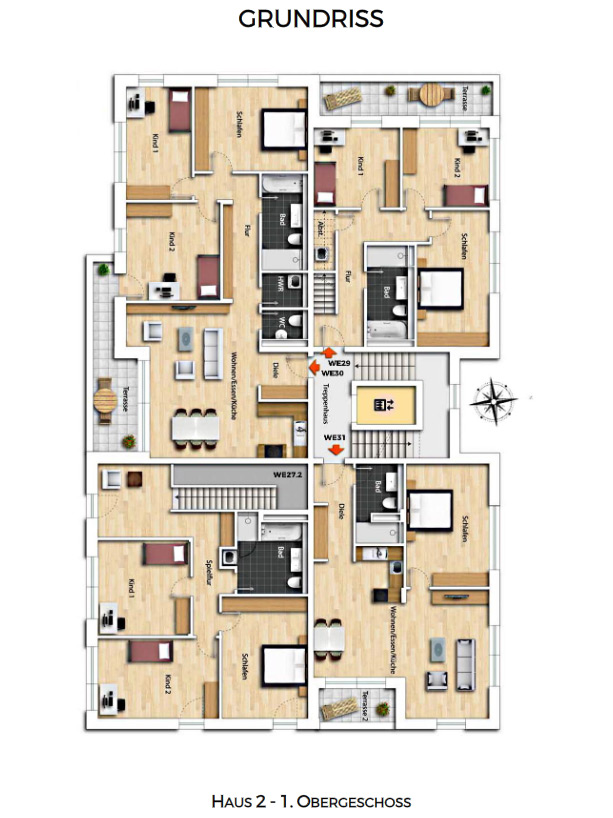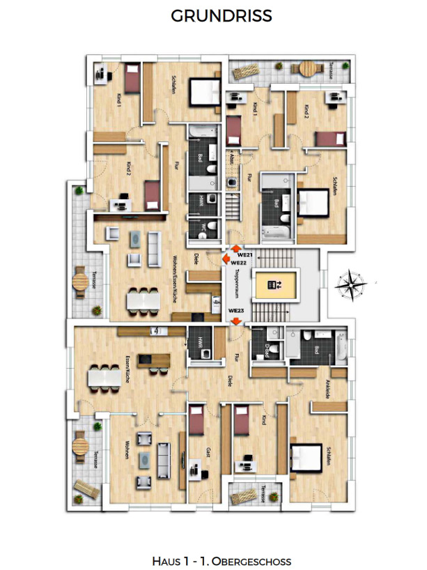Each building have 9 or 10 residential units with living space from approx. 58 m² to 170 m². From the classic 2-room apartment to a large maisonette apartment with large terraces, everything is included. Apartments on the ground floor are planned as barrier-free, and the upper apartments have fireplaces on the 3rd floor.